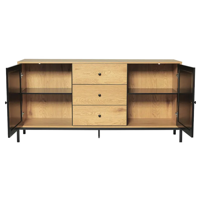 Elevate your living room decor with this Storage Cabinet, a sleek and functional piece that offers both storage space and display possibilities. This storage cabinet features a two-tone colour scheme, a light oak body plus black cabinet doors, adding a touch of modern sophistication to your living space. The three deep drawers are perfect for quick clean-up and storage of daily essentials. All drawers sit on fully extendable drawer runners, ensuring they glide open with ease and durability.