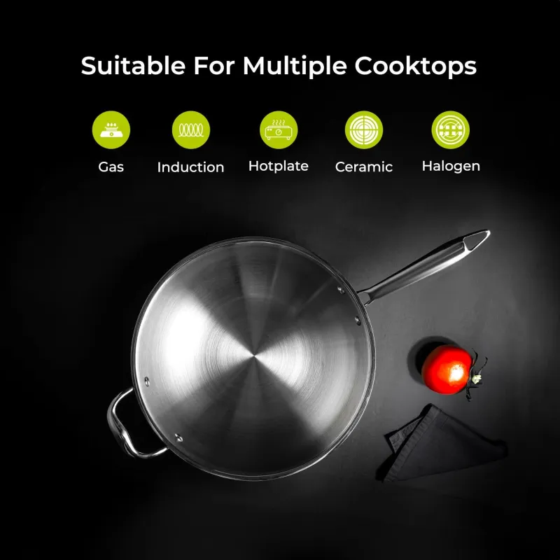 26cm Stainless Steel Tri-Ply Wok Pan With Lid