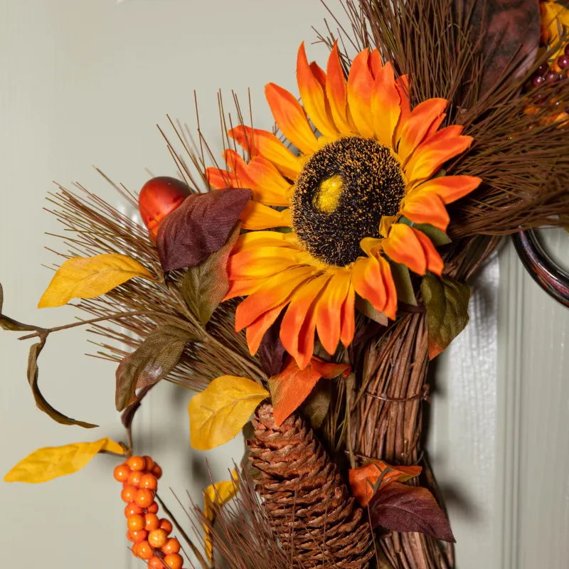 Embrace the cosy warmth of the changing season with this Golden Sunflower wreath. An Autumn wreath is a great way to add some seasonal cheer to your home and dress up your front door for the upcoming cosy months ahead. This stunning artificial wreath features seasonal colours such as; orange, yellow and burgundy. With Golden sunflowers, pinecones and berries, this wreath reflects the season making this an eye-catching decoration. With a 45cm diameter and a rustic rope hanging loop, the wreath is easy to hang on your door or use as a centrepiece for the dining table decorations. Autumn wreaths take on a celebratory role, welcoming the harvest and symbolising abundance. Suitable for indoor and sheltered outdoor use. Product Dimensions Wreath Diameter: 45cm Wreath Depth: 8cm Hanging Loop: 5cm.