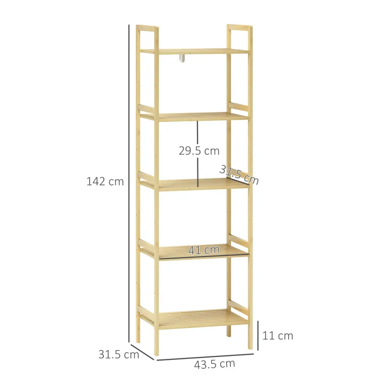 Organise your bathroom with ease using this sleek and practical bamboo shelf unit from HOMCOM. Crafted with natural strength and a water-resistant coating, it’s built to withstand the humidity of daily bathroom use. With five shelves that can be adjusted to nine different positions, you have the freedom to customise your storage to suit everything from towels to toiletries and more.