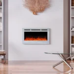 Surprise your guests with the realistic flames of this wall mounted electric firepalce. The realistic LED flames are set in a pile of crystals that offers all the appeal of an authentic fireplace. The crystals are behind durable tempered glass with a contemporary steel frame. Enjoy your smoke-free air while feeling warm during a cold night.