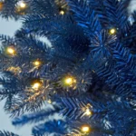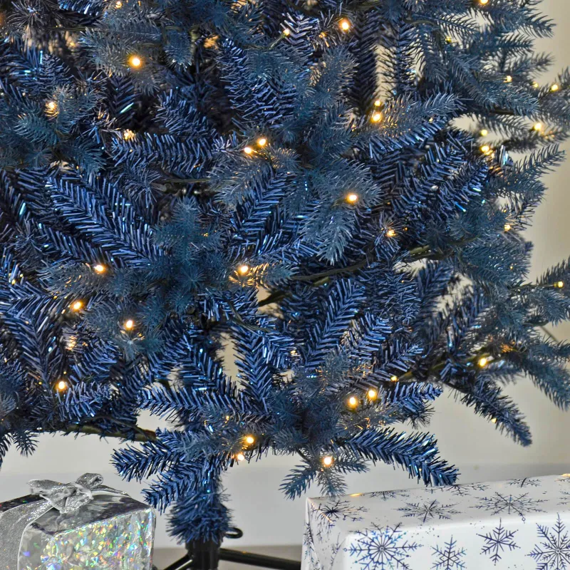 The pre-lit navy blue tree comes already decorated with static warm white LED lights. The blue pine branches are a mix of standard and metallic finish for extra sparkle. Available in 6ft and 7ft sizes with folding black metal stand.