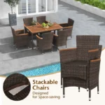 This garden furniture set includes a table and 6 chairs. The dining table features a large tabletop made of selected acacia wood, offering delicate texture and also not easy to deform after long time use. The garden chairs are built with high backrest and armrest with acacia wood top, ensuring ultra comfort during sitting. The included seat cushions are filled with soft sponge and waterproof cover. You can also remove the zippered cover for washing. The exquisite hand-woven rattan will add more charm to your space, suitable for patio, backyard, garden, poolside and more. If you are looking for a 7 Pieces Garden Rattan Furniture Set like this, do not hesitate to place an order! 7 Pieces Patio Dining Set: A dining table and 6 garden chairs create a pleasant place for your enjoyable gatherings. Up to 6/8 people can sit together and have interesting chatting in the backyard, balcony, porch, patio and so on. Note: The 7pcs outdoor furniture set will be delivered in 3 boxes and they may arrive at different times, while the 9pcs set will be delivered in 4 boxes. Large Acacia Wood Tabletop: Unlike a normal rattan outdoor dining set, the table of this garden furniture set is built with a large tabletop made of selected acacia wood, offering ample space to enjoy food or play games. Besides, the treated acacia wood features high anti-corrosion ability, which is durable for long-time use. Comfortable and Stackable Chair: The patio chairs are crafted with high backrest and armrest with acacia wood top, providing ample support to your body for a more comfortable user experience. And each chair has a soft seat cushion for increased comfort. When not in use, the garden chairs can be stacked for space-saving storage. Stable Construction and All-Weather Rattan Material: Made of high-quality PE rattan wicker and metal, the garden dining chairs and table are not only able to withstand large weight, but also endurable for long time outdoor use. The non-slip foot pads ensure better stability. Moreover, the zippered polyester seat cushion cover is waterproof and removable for washing. Easy Assembly: With detailed instruction, you can finish the assembly of this 7PCS/9PCS patio dining set easily. Please do not tighten all the screws until all the holes are aligned to facilitate the installation. Please refer to the size instructions before purchasing to avoid unnecessary trouble.