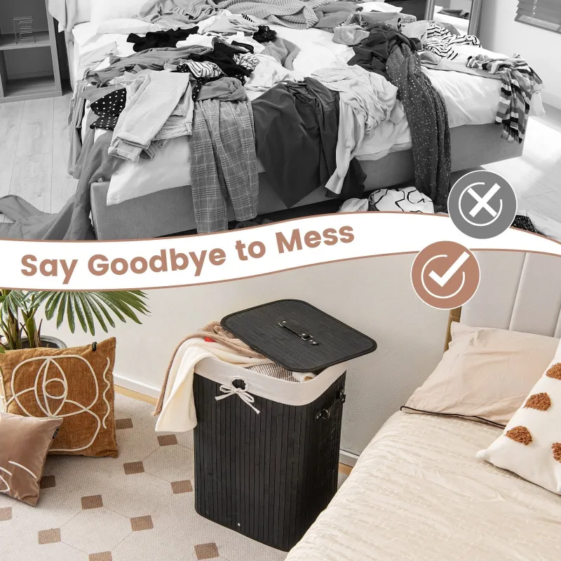 72L Bamboo Laundry Basket with Lid and Washable Liner Bag-Black