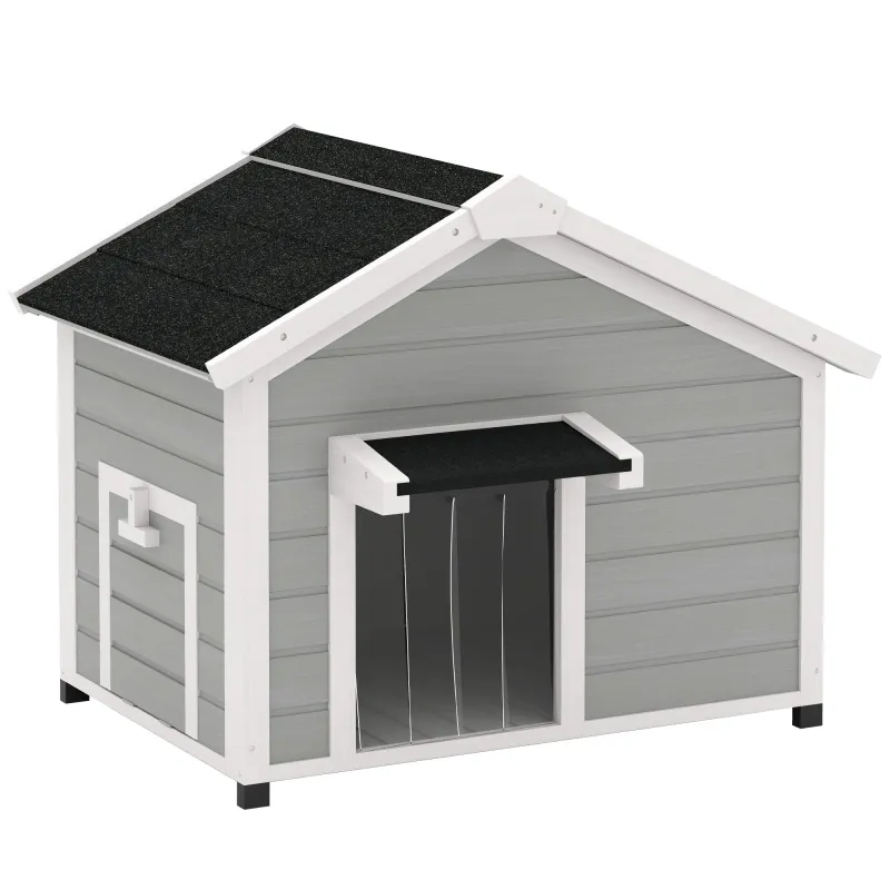 Wooden Dog House Outdoor with Openable Roof, Removable Floor, Curtain, Elevated Feet, for Medium Dogs, Light Grey