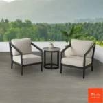Elevate your outdoor space with the sleek and modern Formia 3-piece outdoor set, designed for ultimate comfort and style. This set includes two chairs and a simple side table with a stunning sintered stone top, is rust-free aluminium construction. Deep-seating cushions are extra plush and tailored with high-quality Sunbrella fabric that is easy to clean and UV-resistant. This set features a clean, contemporary look with a focus on durable materials and luxurious comfort.