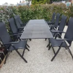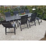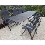 This outdoor table, measuring 1.5m by 2.7m, is ready for any event, surprise or planned! Stylish and amazingly comfortable, the recliner chairs have the added bonus of a textilene seat on the traditional Portofino frames.