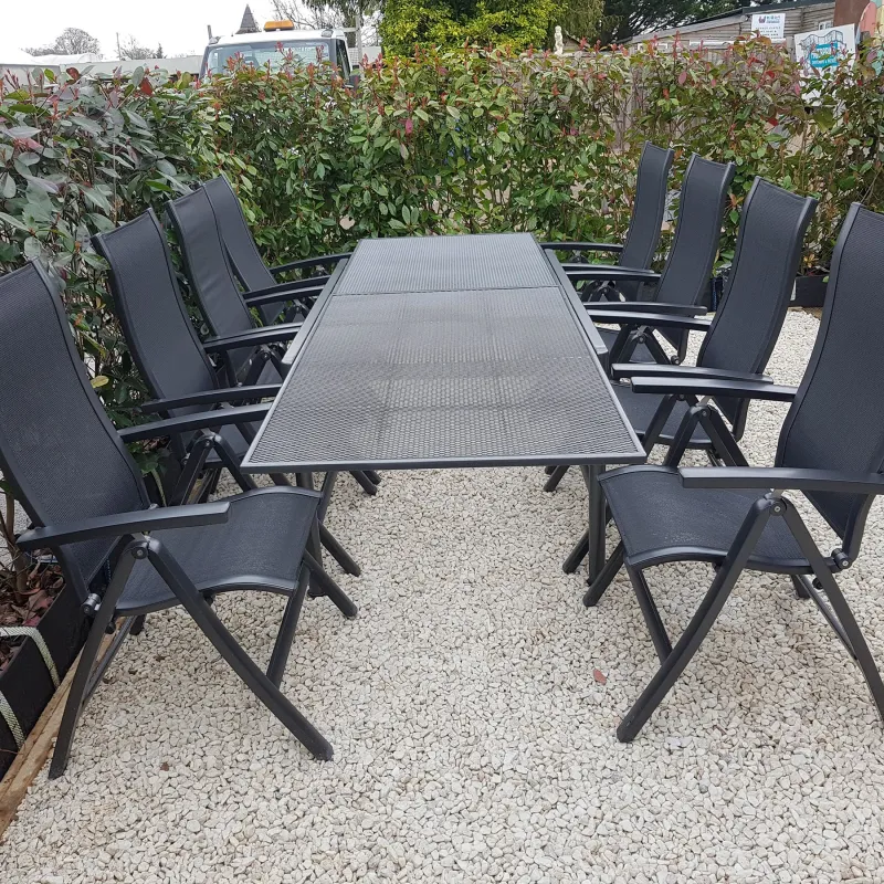 The Alexander Rose Portofino 8 Seater Metal Garden Furniture Set with Extending Table & Recliner Chairs is a great option for outdoor dining. For social gatherings, the rectangular mesh top table with stackable recliner chairs is perfect.