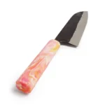 The knife has an octagonal handle made from waste plastic. The plastic is washed, shredded and melted into the handle shape. The vibrant shades of pink, yellow and orange are reminiscent of fruit salad sweets. No two handles are the same, so each knife has its own unique pattern.