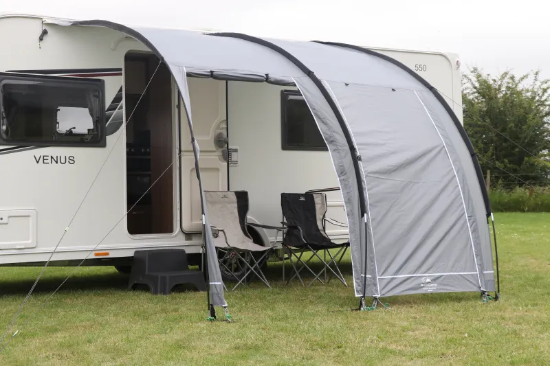 Our ARCO SUN CANOPY can be pitched at variable heights/depths offering flexibility with curve appeal. With roll up zip front panels with canopy option and dual beading this sun canopy is perfect for your caravan, campervan* or motorhome*.