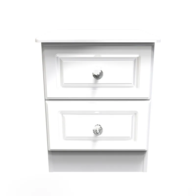 This 2 drawer bedside cabinet is practical and stylish. Perfect for any bedside or as a free standing storage unit. This is a stylish extensive range of bedroom furniture. It is beautifully finished with a high gloss veneer, featuring crystal handles to suit a glamorous lifestyle. Easy to maintain with scratch resistance surfaces. All our furniture is made to order in the United Kingdom, to the highest quality. It is delivered within 10 working days direct to your location of choice by one of our two man delivery teams, and comes fully assembled (although legs may be removed to prevent damage in transit). Part of the Balmoral Collection.