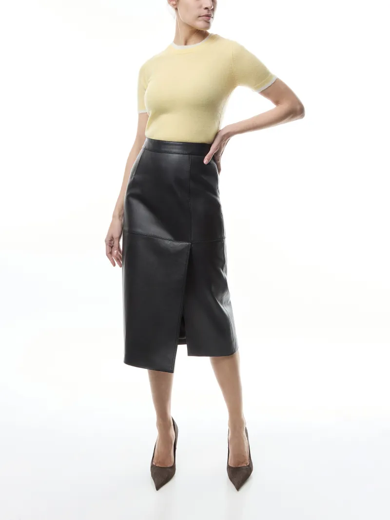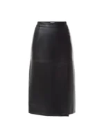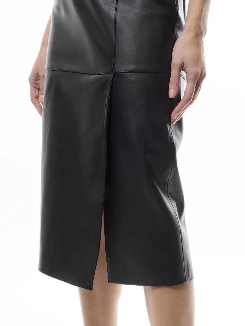 This timeless leather knee-length skirt boasts an essential fit and a gritty slim cut at the top. The side slit adds a chic touch.
