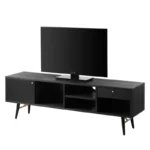 The Barcelona TV Unit 1500 Black And Copper is made of black oak melamine, powder-coated black metal legs, copper metal accents.
