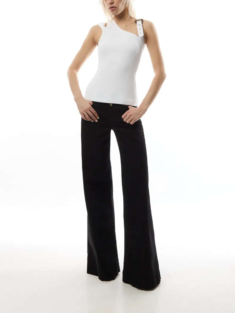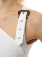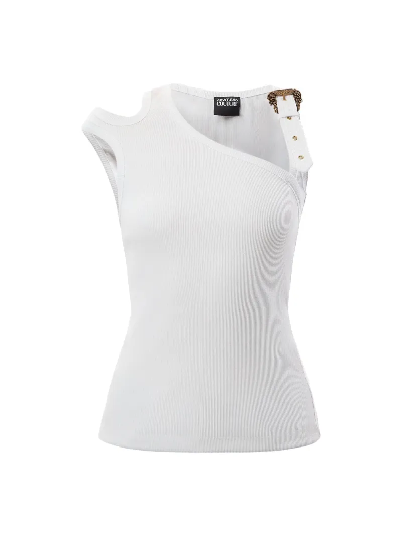 This sleeveless ribbed tank top features an adjustable shoulder strap with a Baroque buckle.