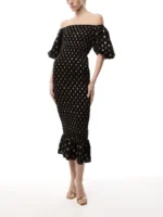 Get ready to turn heads in our Black Jojo Dress with Gold Fleck! This stunning dress is not average little black dress – it features subtle gold flecks that add a touch of glamour. The perfect choice for a night out or special occasion, it will make you feel confident and stylish.