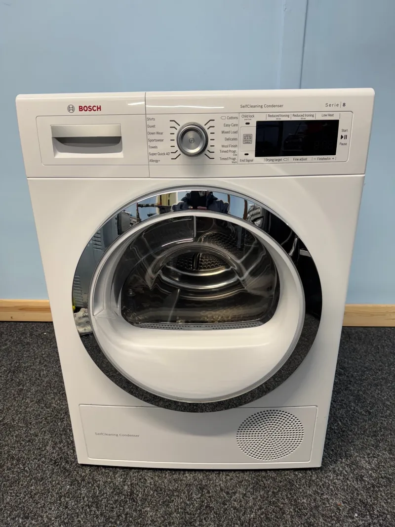 Introducing the Bosch Serie 8 WTW87560GB Heat Pump Condenser Tumble Dryer, a high-capacity appliance designed to meet the drying needs of modern households. With a generous 9 kg load capacity, it efficiently handles large laundry loads, making it ideal for families. The sleek white exterior complements any contemporary home décor, adding a touch of elegance to your laundry space.