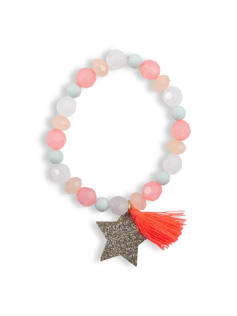 Tassel tastic! This sassy bracelet incorporates a bright orange tassel pendant with a gold glitter star to add some sparkle.