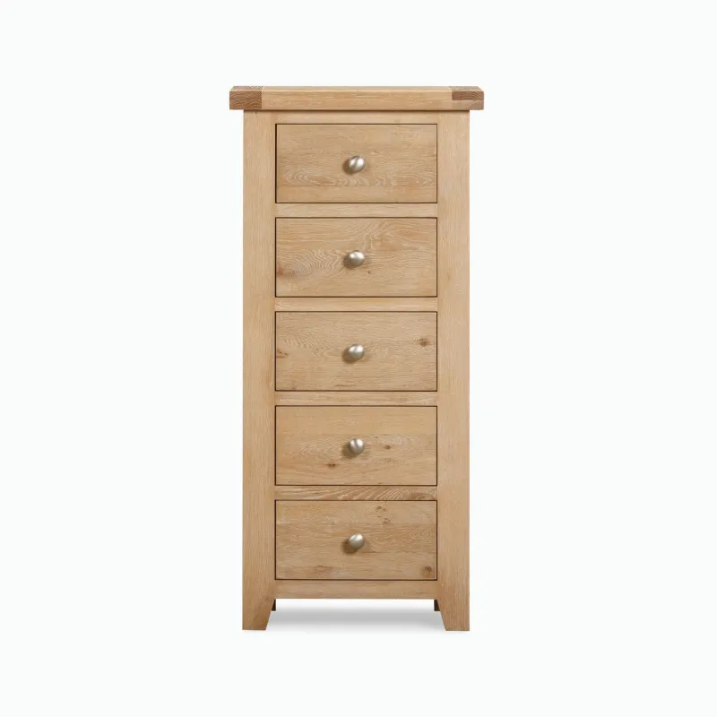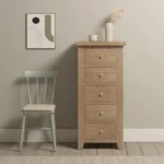 The Burford 5 Chest of Drawers in Natural Oak combines luxury with a rustic appeal, offering both elegance and practicality. This piece is from our Burford Natural Range, crafted from whitewashed oak, showcasing a beautiful balance of natural wood grain with a subtle, light finish that enhances its timeless charm. The strong, clean lines give the chest a sturdy presence, while its functional design caters to modern storage needs. Just as no two trees are alike, all of our specially curated natural oak pieces have unique grain patterns making each piece a truly individual work of art. Each item tells its own story, adding character and charm to any space, making it the perfect finishing touch to your home.