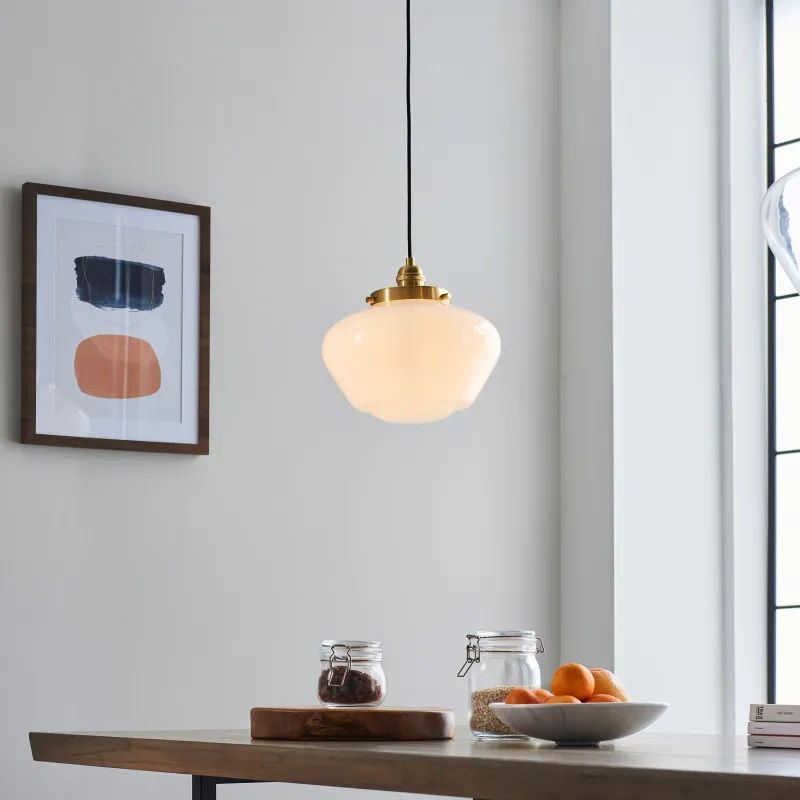 A timeless “school house” styled pendant in brass with opal glass, ideal for the kitchen, above a breakfast bar or dining table. Hang individually or in a set of three. Matching semi flush also available.