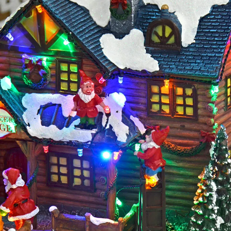This cute Reindeer Lodge snow scene gives you festive lights, music and action!