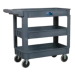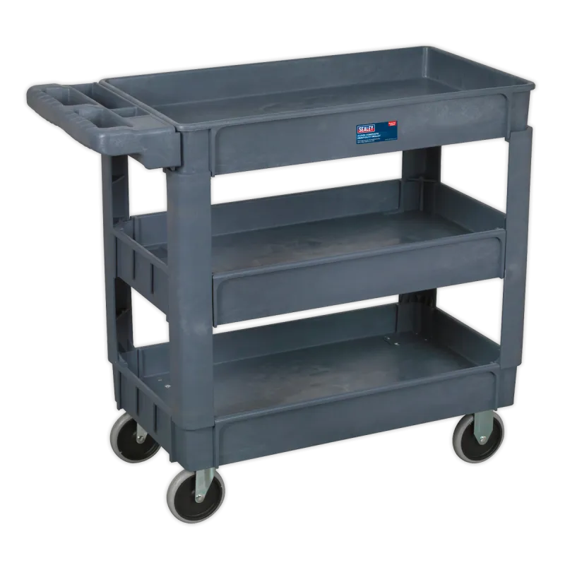 Heavy-duty garage and workshop trolley with a huge 83kg capacity per shelf. Manufactured from extra-strong impact resistant plastic. Ideal for a wide variety of applications. Features deep wall shelves and tool storage compartments built into the contoured handle. Fitted with four large rubber wheels, two fixed and two swivel castors.