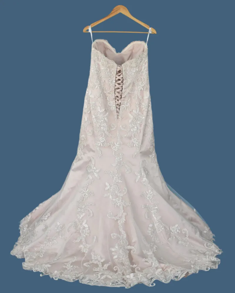 This wedding dress is blush pink in colour. It is a strapless style with a sweetheart neckline, fitted body and a fishtail full-length skirt. The dress has a white net overlay with a floral lace applique. There are delicate clear sequins over the lace and heavier beading embellishment at the neckline. The back has a corset to fasten, with a modesty panel.