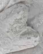 This wedding dress is labelled size 12. The measurements of this dress are bust 34″, waist 30″. The front of the dress measures 52″ in length from bust to hem. The back measures 63″ including the train.