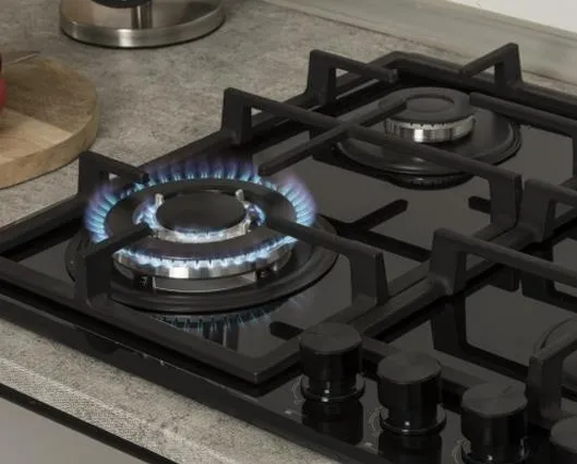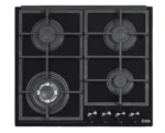 Black Creda 60cm Gas Glass Hob This 60cm 4 zone gas on glass hob features an extended burner zone, a wok burner, cast iron pan supports, front controls and auto ignition.