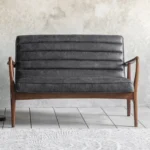Stylish mid-century 2 seater sofa in Antique Ebony top grade leather depicting natural textures and grains, decorative horizontal channel stitched detailing and a solid oak angled frame.