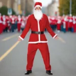 This costume includes a white and red suit and hat with a white beard and a black belt.