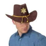 Add the perfect finishing touch to your Wild West Sheriff, tin star depute, police chief and many more fancy dress costumes with this Deluxe Suede Sheriff Hat for adults. The deluxe depute hat is made from dark brown faux suede. The classic stetson style hat has a wide brim and high crown with gold star depute badge. It also features a gold cord hat band. One size fits most adults