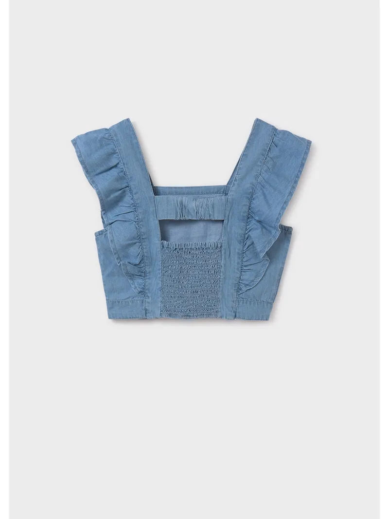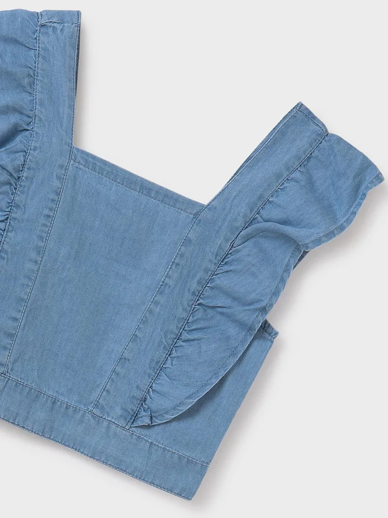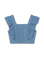 Introducing the Mayoral Older Girl Denim Top, Blue: a must-have for any fashion-forward girl! This sleeveless crop top boasts delicate frill details, adding a touch of femininity to the classic denim look. Trust us, you won’t want to miss out on this stylish piece.