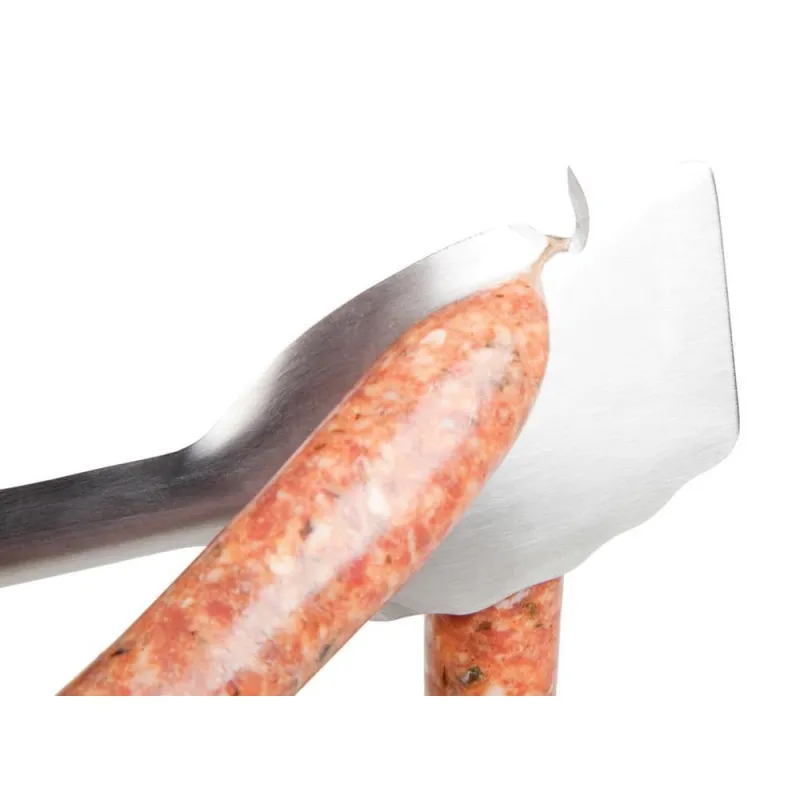 Perfect for the barbecue, with in-built sausage skin cutter, sausage prick and tips cleverly shaped to scrape and pick up small pieces of food. Unique bend in the handle keeps the tips sitting up, keeping your bench and counter tops clean and your Clongs hygienic. The stainless steel arms are extremely durable so you can use your Clongs for scraping, cleaning, cooking and serving straight from the barbecue. Open and lock your Clongs easily with one hand thanks to the clever click-lock button mechanism.