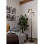 The TOWNSHEND floor lamp is made of black metal and has two wooden arms, one on either side. Suspended from the wooden arms are two black lamp holders. With its eye-catching mix of pinewood and metal, the floor lamp complements vintage and industrial-style interior design trends. The floor lamp switches on and off easily using the in-line switch. Whether in the bedroom, living room or dining room, it provides modern lighting for any interior. The product has E27 lamp holders and requires 2 x E27 lightbulbs, which are not included.