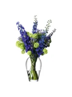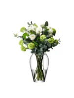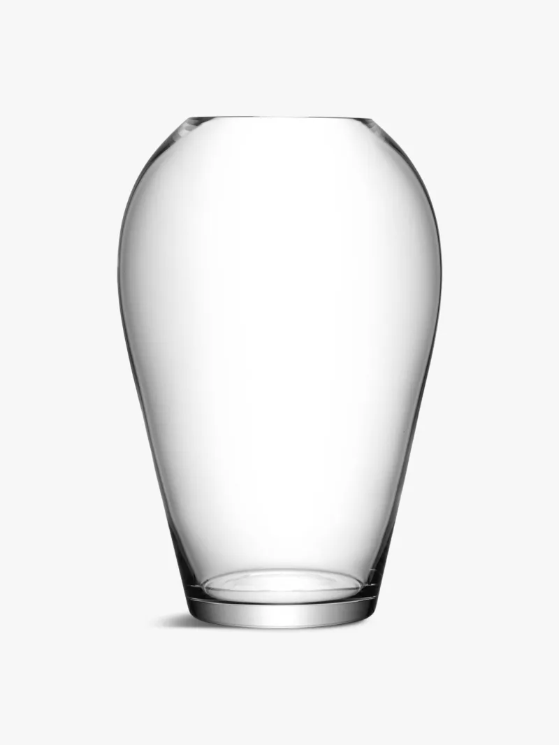 A mouth-blown glass vase with thick walls which curve at the top to narrow the opening. Designed for tall stems of flowers or foliage.