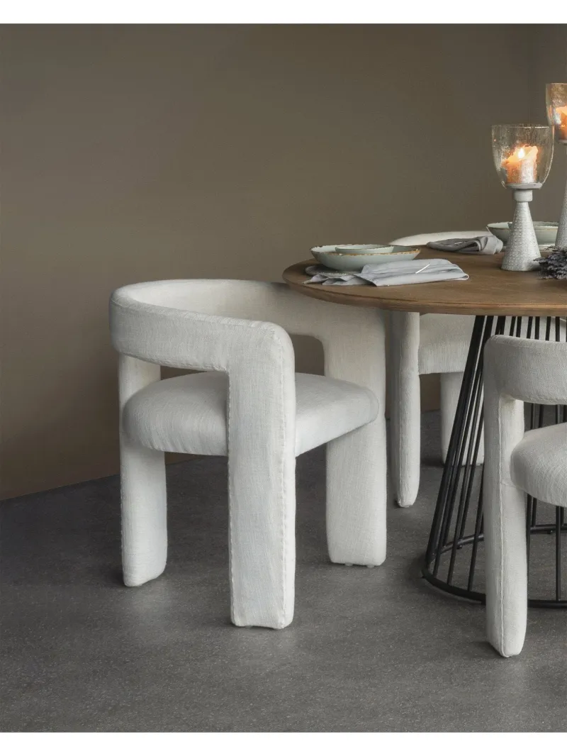 Fully Upholstered Ivory Slub Chair, a versatile and stylish addition to any interior. This chair boasts a striking three-leg design that oozes style, and its solid wooden frame is expertly covered in a heavy slub fabric where imperfections are celebrated as key features. Versatile as a dining chair or an occasional chair. Seat Height 43cm Seat Internal 50 x 48 (WXD)