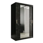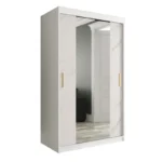 Organize and elevate your bedroom with the Geneva T1 Sliding Door Wardrobe. Measuring W120cm x H200cm x D62cm, it features two sliding mirrored doors, five shelves, and two hanging rails for ample storage. The PVC finished edges and gold metal handles add a touch of sophistication. Assembly required and optional drawer available for purchase.