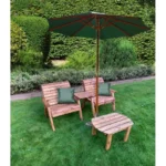 The components of this product can be also used separately. To maintain freshness, it is best practice to store cushions indoors when not in use. It is advisable to only use the parasol in conjunction with the provided parasol base. Made from sustainably sourced materials – the Scandinavian redwood used comes from ethically managed sustainable sources built to last. Constructed with rust-resistant galvanised zinc bolts. An oil-based preservative has been added for long term durability. A product proudly made in Great Britain that requires no assembly.