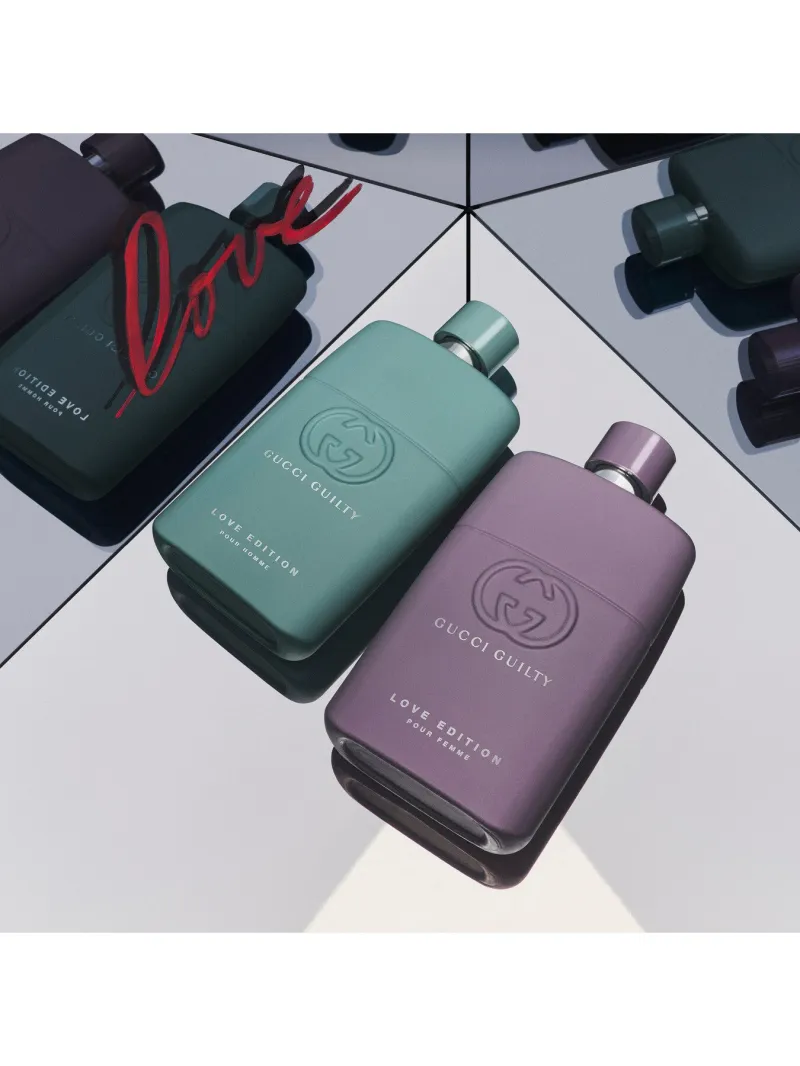 Gucci Guilty Love Edition, a limited-edition Gucci fragrance for him and for her designed to celebrate love in all its forms. This duo sets out to blur the boundaries in fragrances, with a masculine signature ingredient blended in the female scent and a feminine signature ingredient within the male scent to disrupt and reflect this ethos.