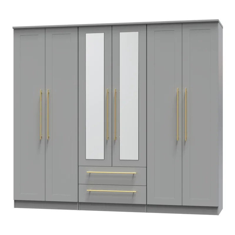 Haworth Tall Mirror Wardrobe Grey 6 Doors 2 Shelves 2 Drawers 222cm
