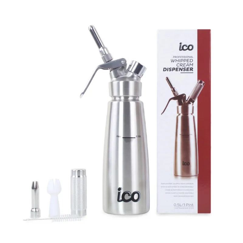 Professional stainless steel whipped cream dispenser for delicious homemade whipped creams, sauces, and desserts – uses 8g N2O cartridges (500ml, Silver). Create fresh and delicious whipped cream with the ICO whipped cream dispenser. Whips 1 pint of double cream into up to 2 quarts of whipped cream in under a minute.