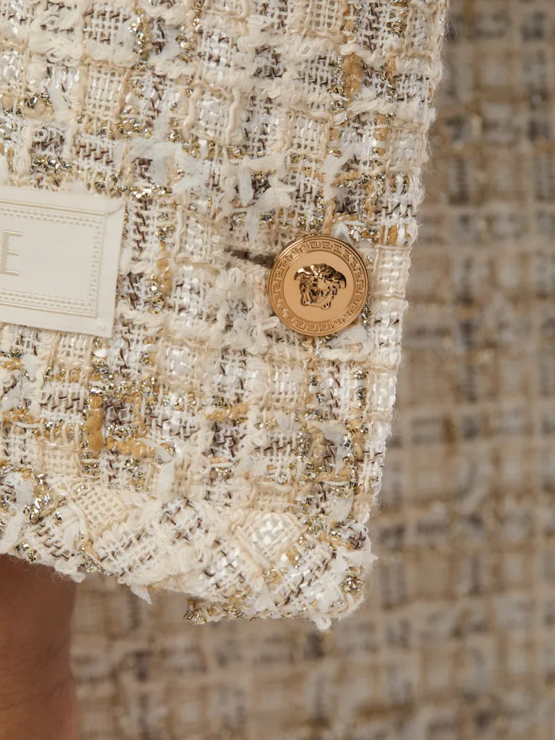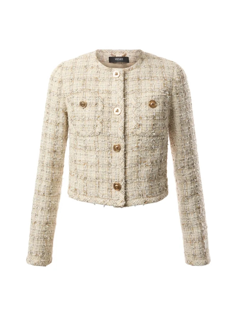 Biscuit cotton casual jacket from Versace featuring long sleeves, round collar, buttons fastening, pockets and gold tone hardware.