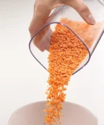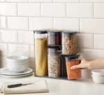 This smart storage container set features a clever stand that allows easy access to any jar, regardless of its position.
