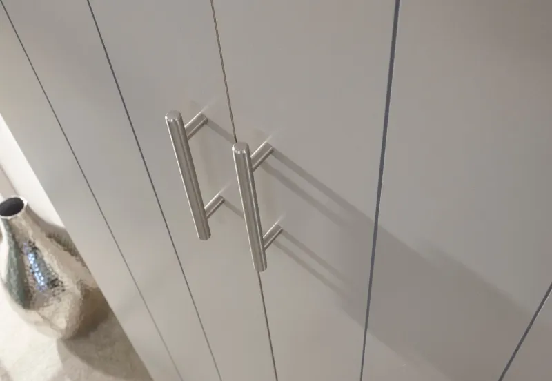 Kinsley brings a touch of country cottage chic to any bedroom – this two-door wardrobe is a perfect example. The robust frame is mounted on a proud plinth and fitted with a pair of planked-style doors, incorporating a handy drawer beneath. The piece is painted in soft grey and finished with a bevelled oak-effect top that adds a natural contrast. Accessorised with brushed steel handles, it makes an elegant choice.