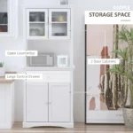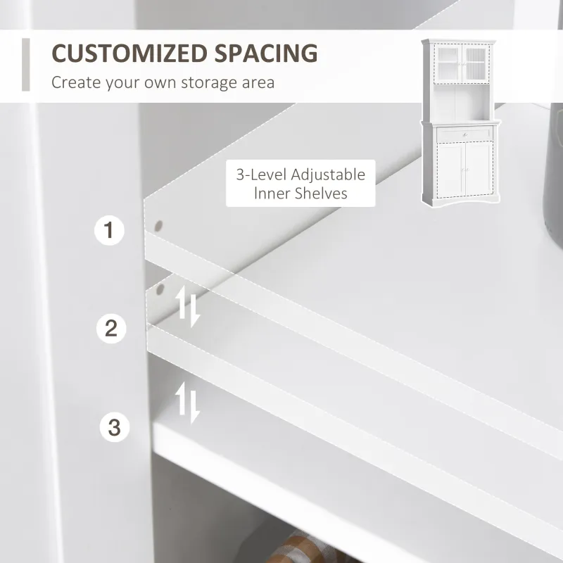 Create a neat and tidy kitchen dining space with this pantry cupboard from HOMCOM. It has two cupboards, both with three-level adjustable shelves, a large drawer and middle shelf: plenty of space for dishes, cutlery, boxes and more. This freestanding pantry cabinet is the perfect companion for your kitchen, complete with anti-tipping straps included to pin to the wall safely.