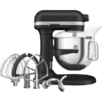 The comprehensive accessory package includes a pouring shield, stainless steel wire whisk, stainless steel paddle, stainless steel dough hook, and silver-coated double flex edge paddle.
