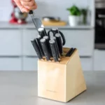 They are neatly stored in a birchwood knife block with a convenient built-in knife sharpener, allowing for easy sharpening with each use.