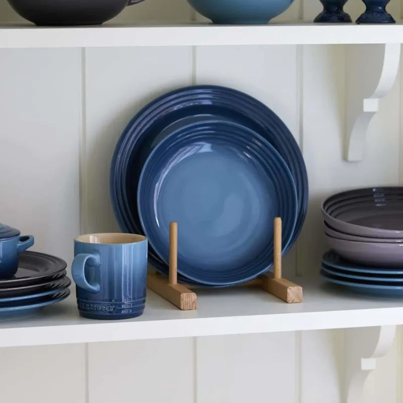 A colourful and contemporary addition to any modern kitchen or dining table, the Le Creuset Dinner Plate Marseille Blue 27cm features a recessed base to contain liquids and a raised rim featuring the signature three-ring branding.