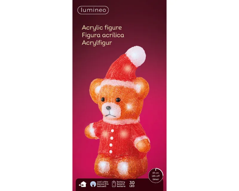 This festive acrylic bear is the perfect addition to your doorstep this christmas, It has 30 cool white LED bulbs throughout the design. Suitable for outdoor use. Battery Powered: 3 x AA required. Product Dimensions: L21cm x W15cm x H33cm
