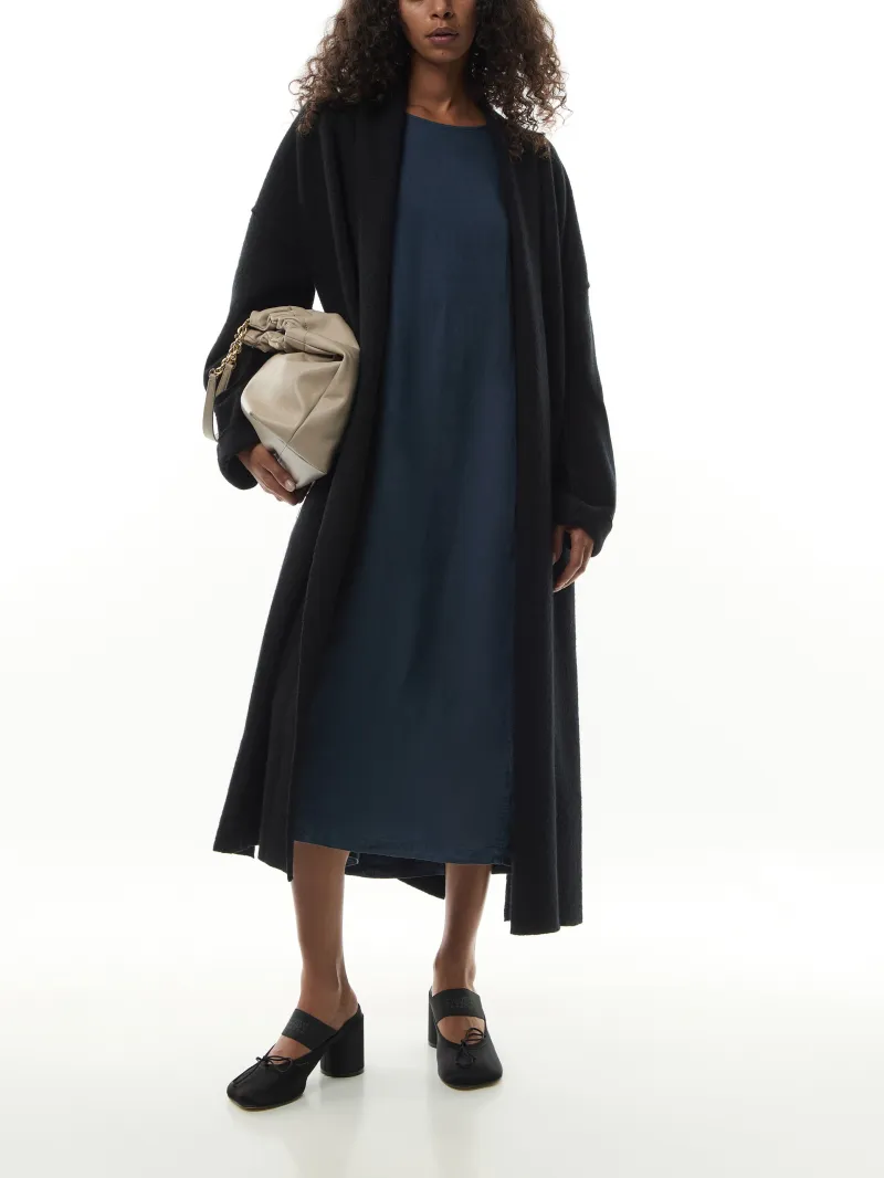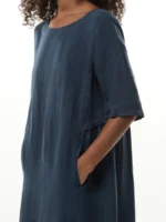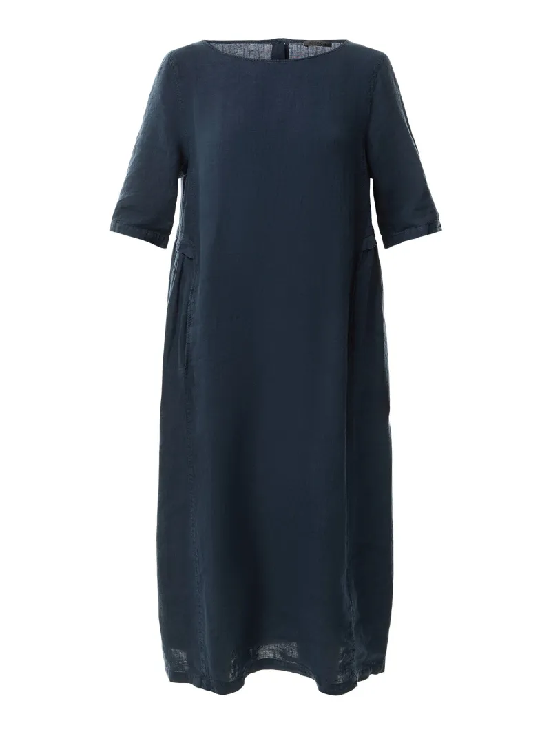 The light and airy summer Kreaativa dress from Oska in pure, breathable linen linen is characterised by its feminine A-line fit. It falls slightly round to about the knee, curved seams and darts underline the special cut and add volume. The model has a round neckline, short sleeves and discreet side seam pockets. Wear it solo or with linen trousers in a culotte look.